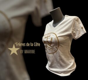 Accueil / Collection Femme / T.shirt Col V Woman ®Frères de la Côte ⭑BY MARINE du S au XXL • Blanc Or / PhotoRoom_20230827_174437