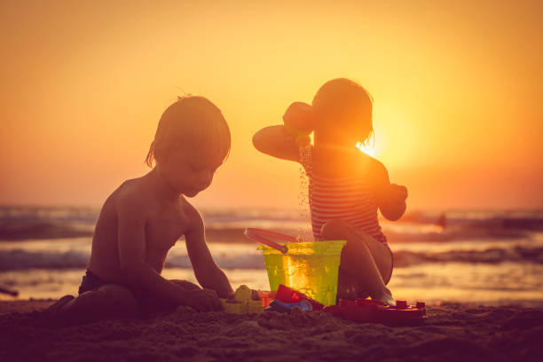 Little boy and girl building a sandcastle on the beach in summer