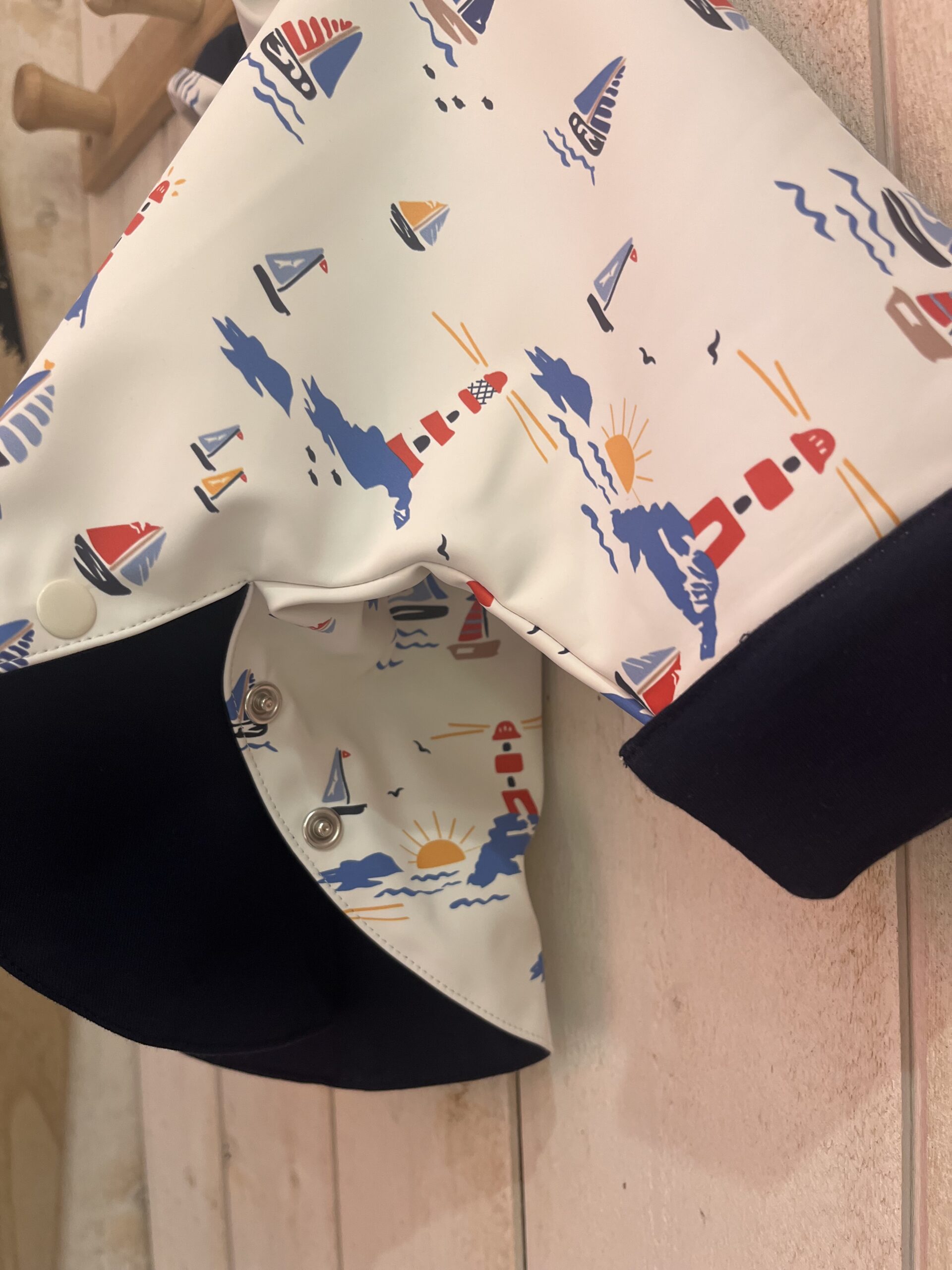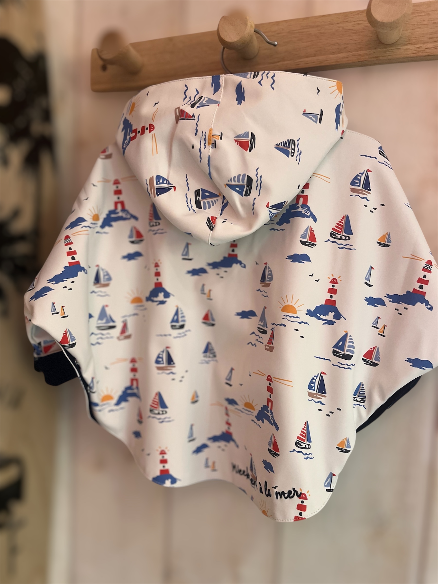 Cette cape ciré est unisexe, doublée coton bleu marine à l’intérieur, son extérieur blanc  imprimé aux motifs marins ( voiliers, phares …) évoque vraiment l’air du large !