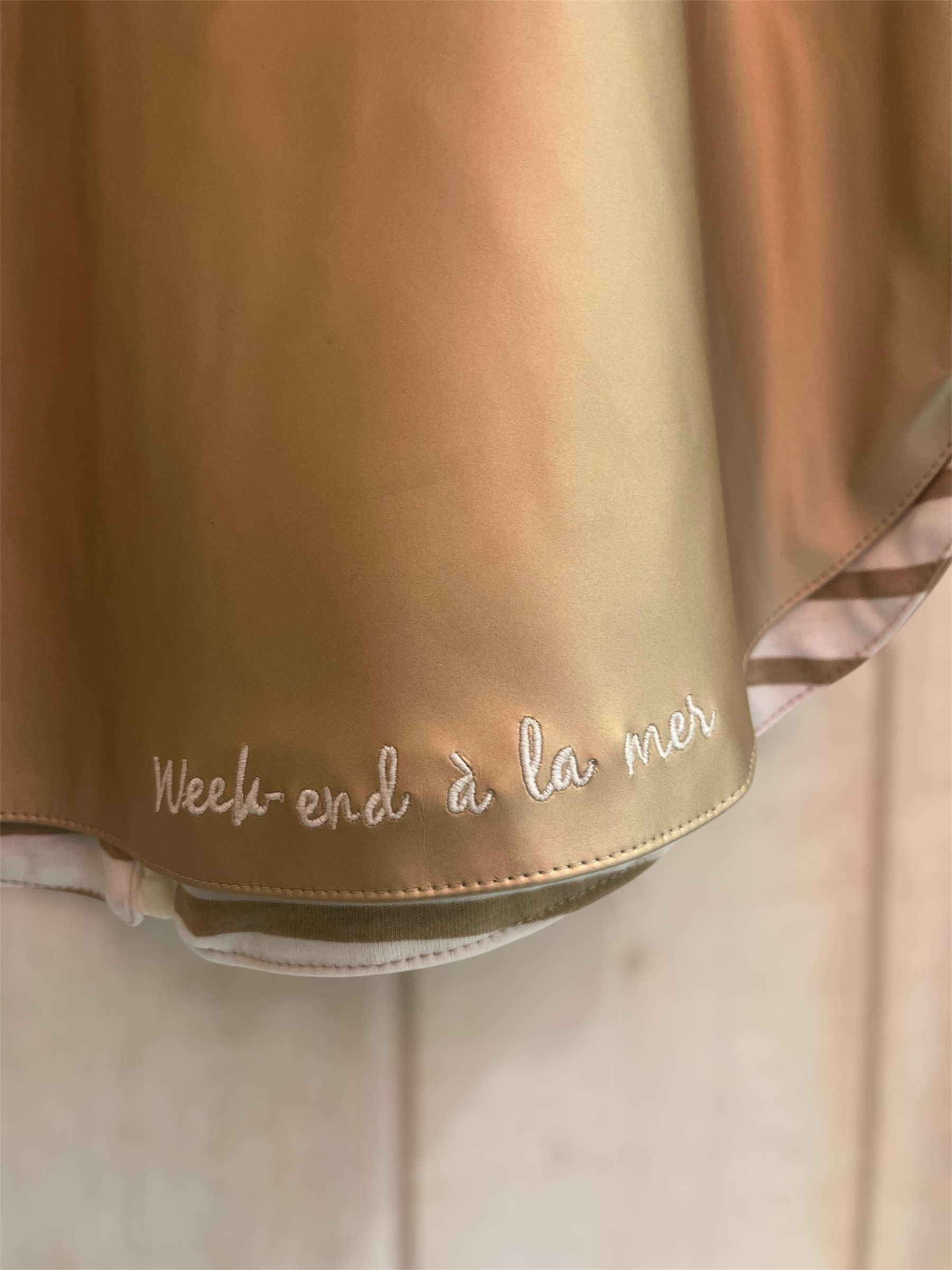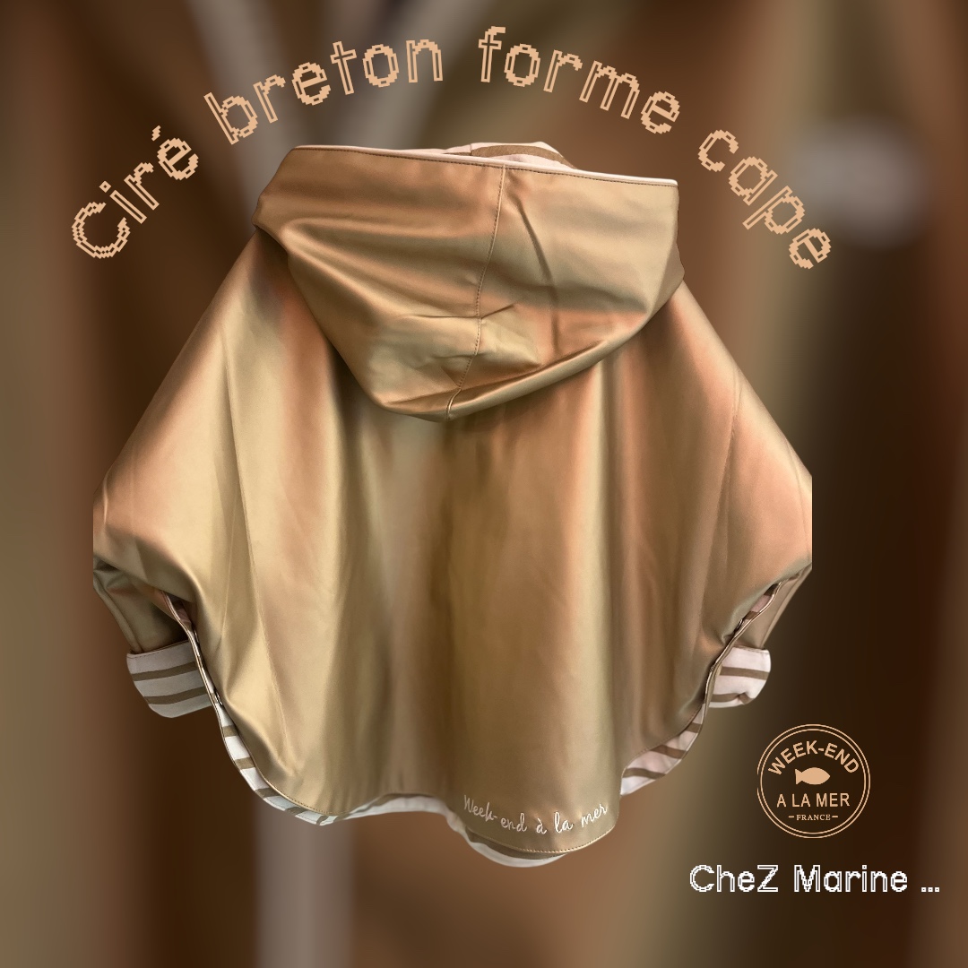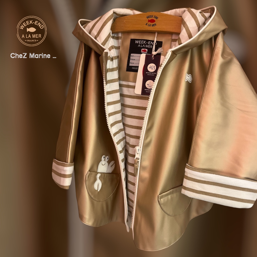 Cette cape ciré est doublée en coton blanc rayée beige à l’intérieur, son extérieur en gomme de coloris or apporte une touche élégante et originale … coup de cœur pour son petit homard en animation sur la poche avant qui évoque vraiment l’air du large !